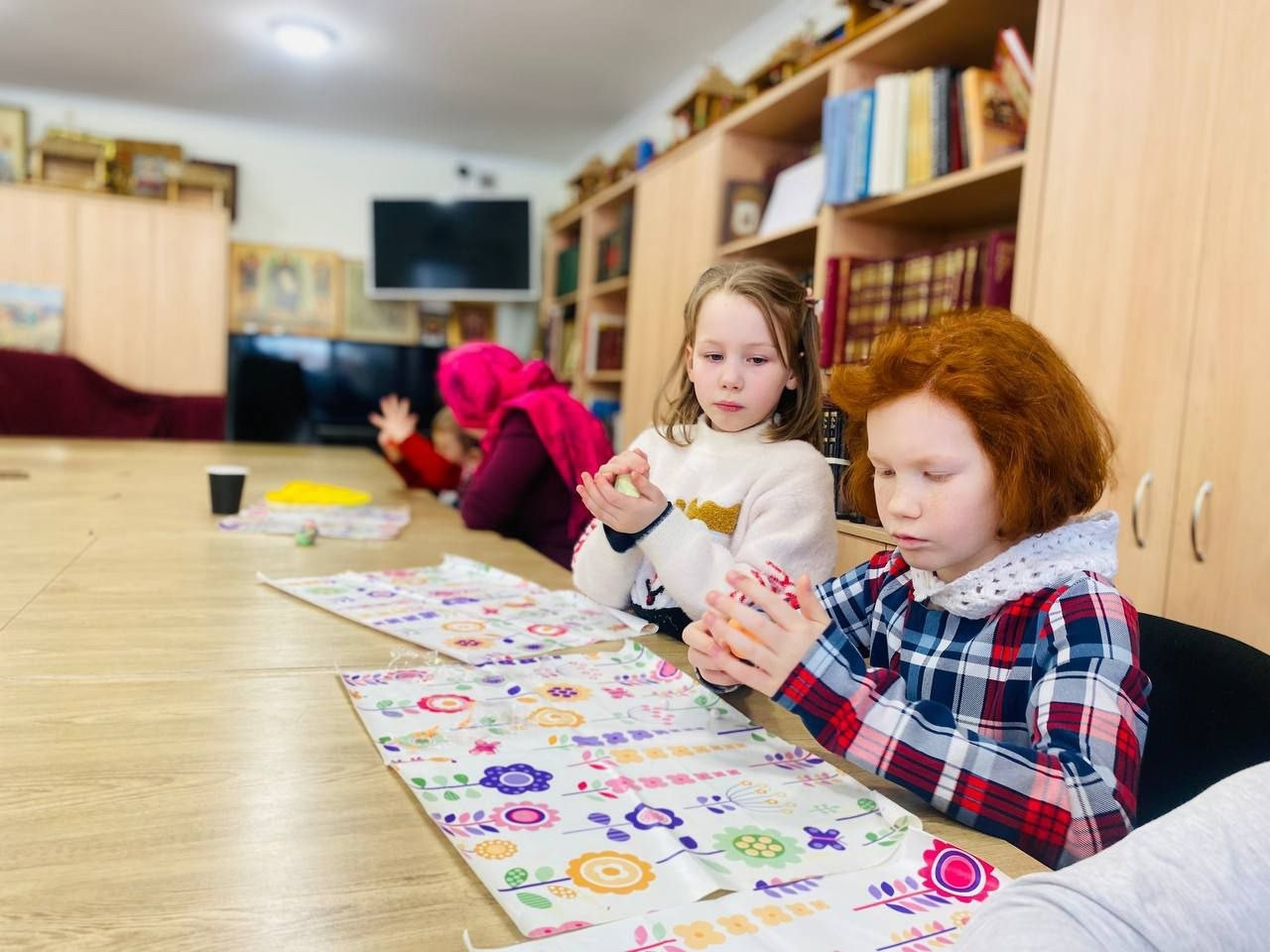 Елена Борисовна учила младших деток формировать яйцо из мягкого пластилина, рассказывая о предстоящем празднике Воскресения Христова!