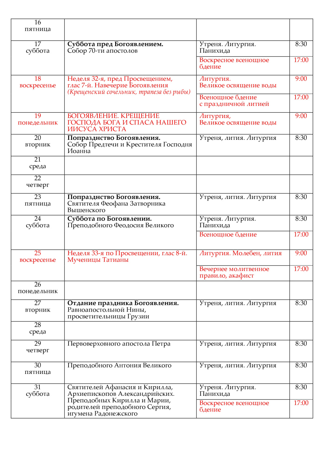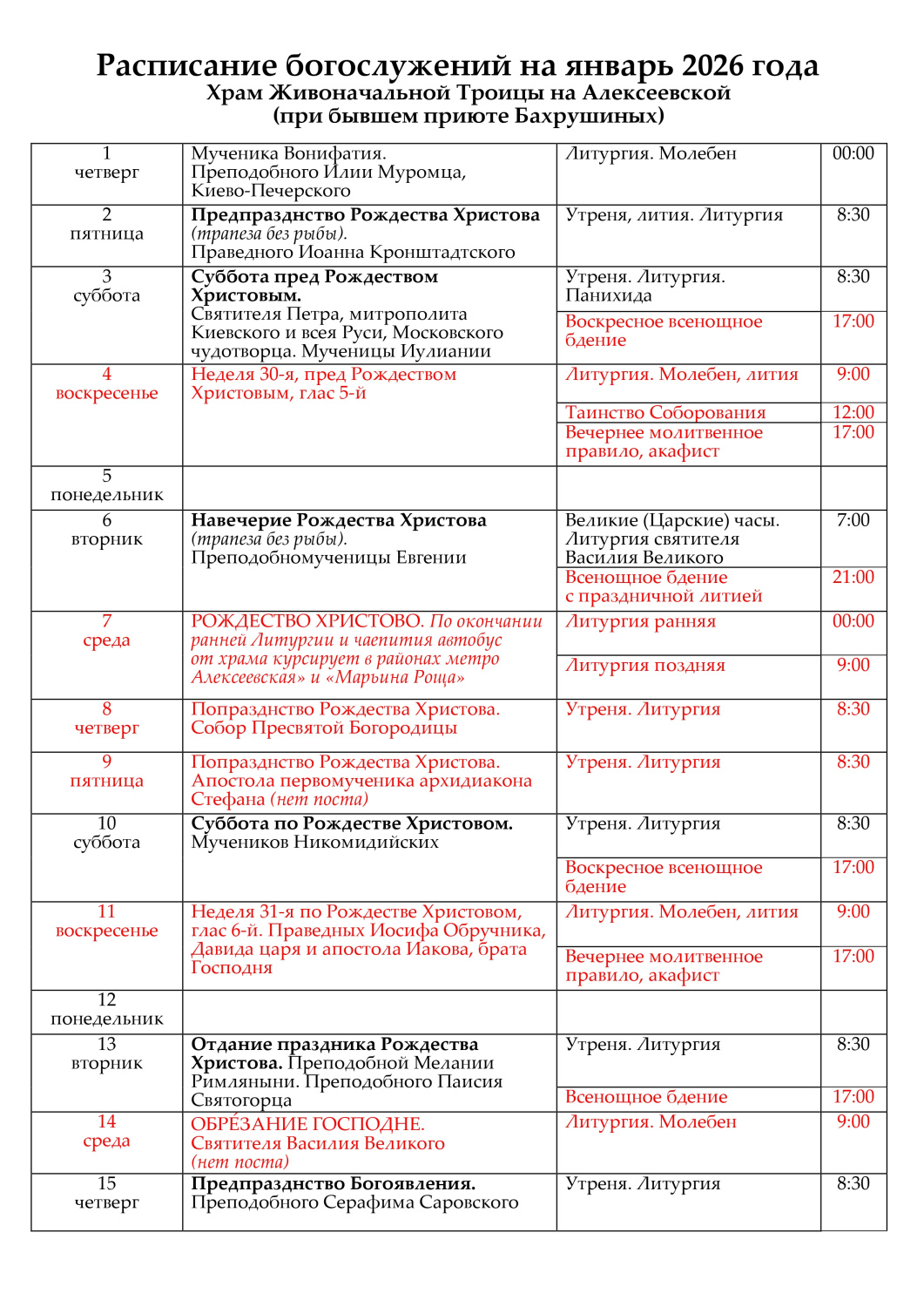Расписание богослужений на январь 31 декабря 2025 Расписание богослужений на январь 2026 в формате PDF/JPG. Формат PDF: с 01 по 31 января 2026 года в PDF Формат JPG: с 01 по 15 января 2026 в JPG с 16 по 31 января 2026 в JPG