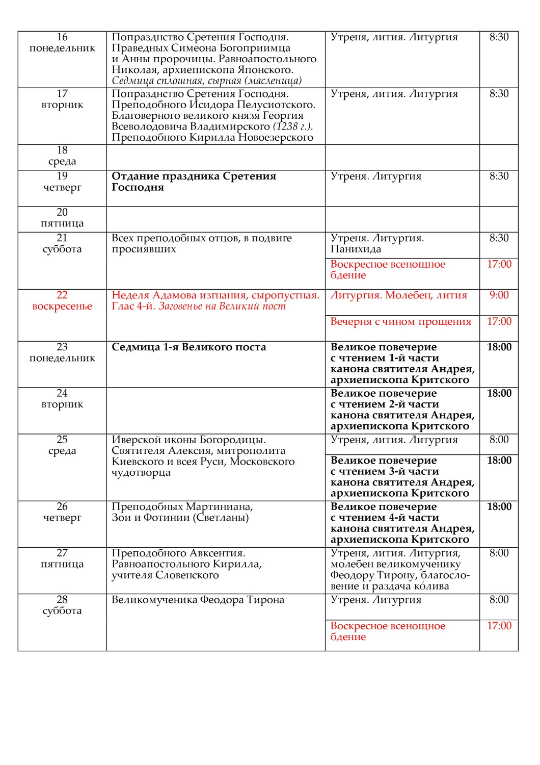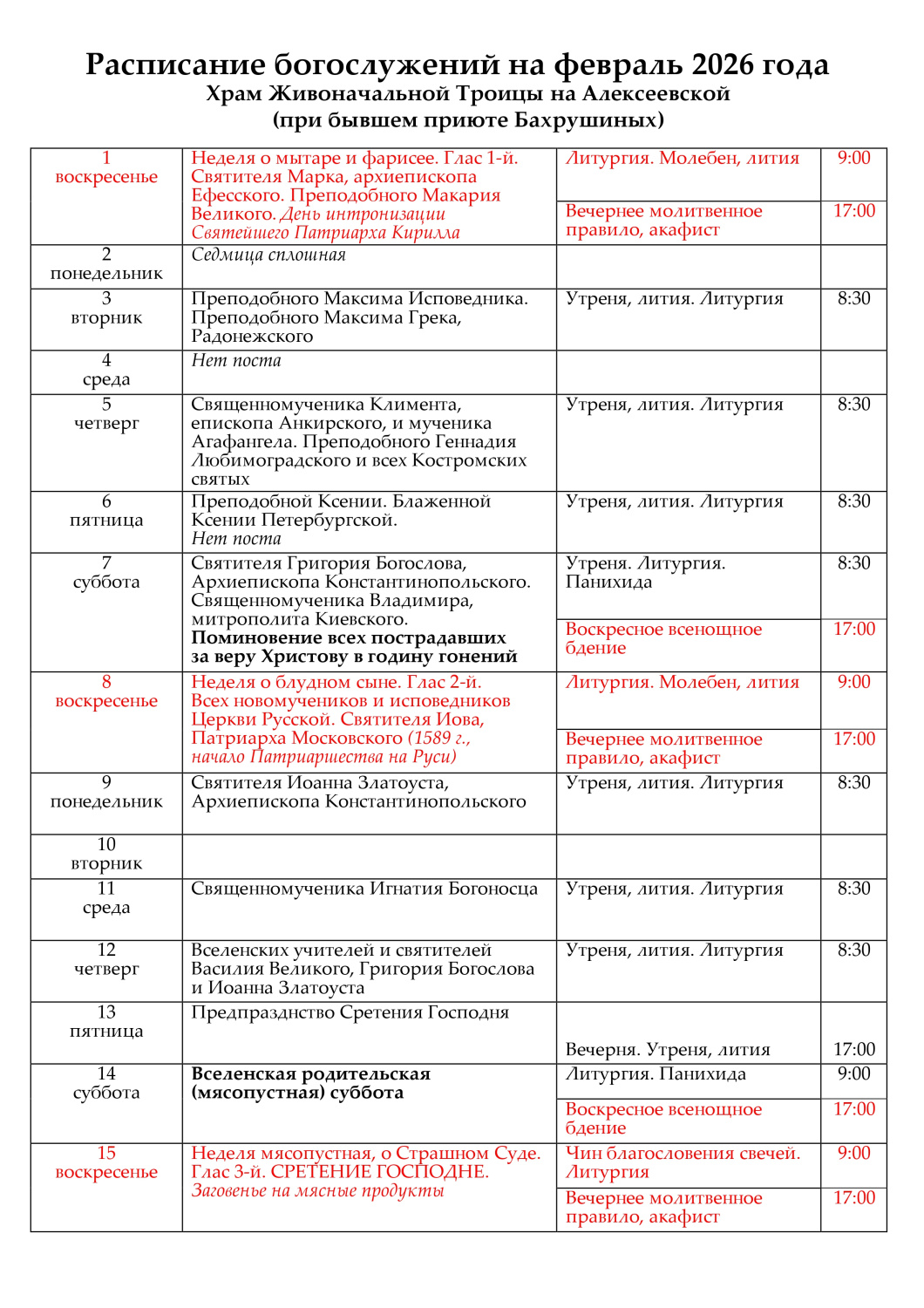 Расписание богослужений на февраль 29 января 2026 Расписание богослужений на февраль 2026 в формате PDF/JPG. Формат PDF: C 01 по 28 февраля 2026 года Формат JPG: с 01 по 15 февраля 2026 года с 16 по 28 февраля 2026 года